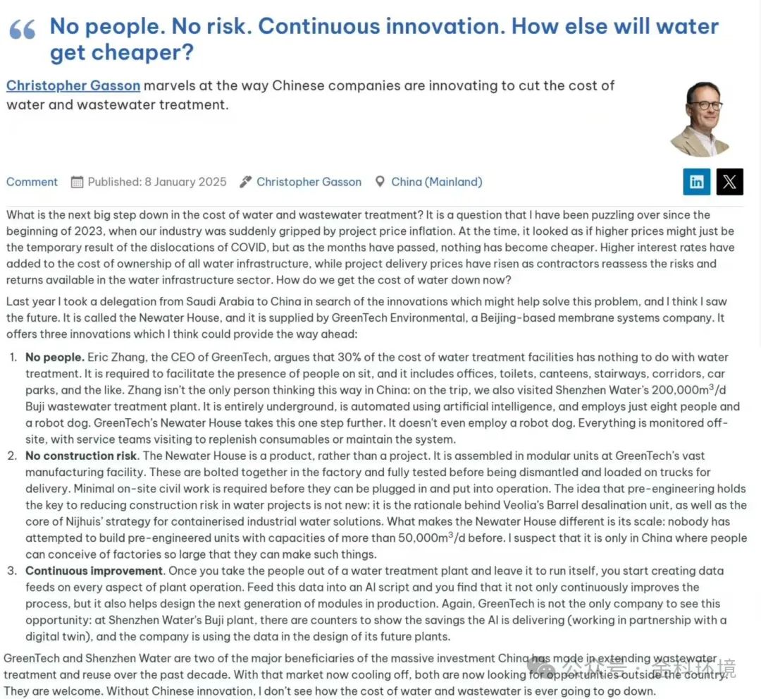 3. Continuous improvement. Once you take the people out of a water treatment plant and leave it to run itself, you start creating data feeds on every aspect of plant operation. Feed this data into an AI script and you find that it not only continuously improves the process, but it also helps design the next generation of modules in production. Again, GreenTech is not the only company to see this opportunity: at Shenzhen Water's Buji plant, there are counters to show the savings the AI is delivering (working in partnership with a digital twin), and the company is using the data in the design of its future plants.